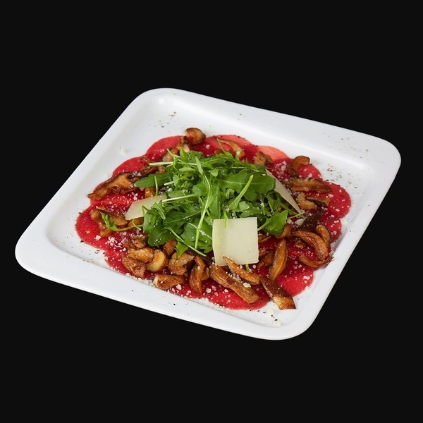 Карпаччо из говядины с белыми грибами и трюфельным маслом, пармезаном и рукколой